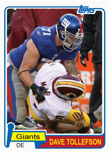 Tollefson has been a backup for a couple seasons now in New York. He is backup to a couple pretty good Pro Bowl type players. Osi Umenyiora and Justin Tuck. He plays almost every game and gets a lot of special teams action. In the photo above he forced Donavan McNabb to fumble.