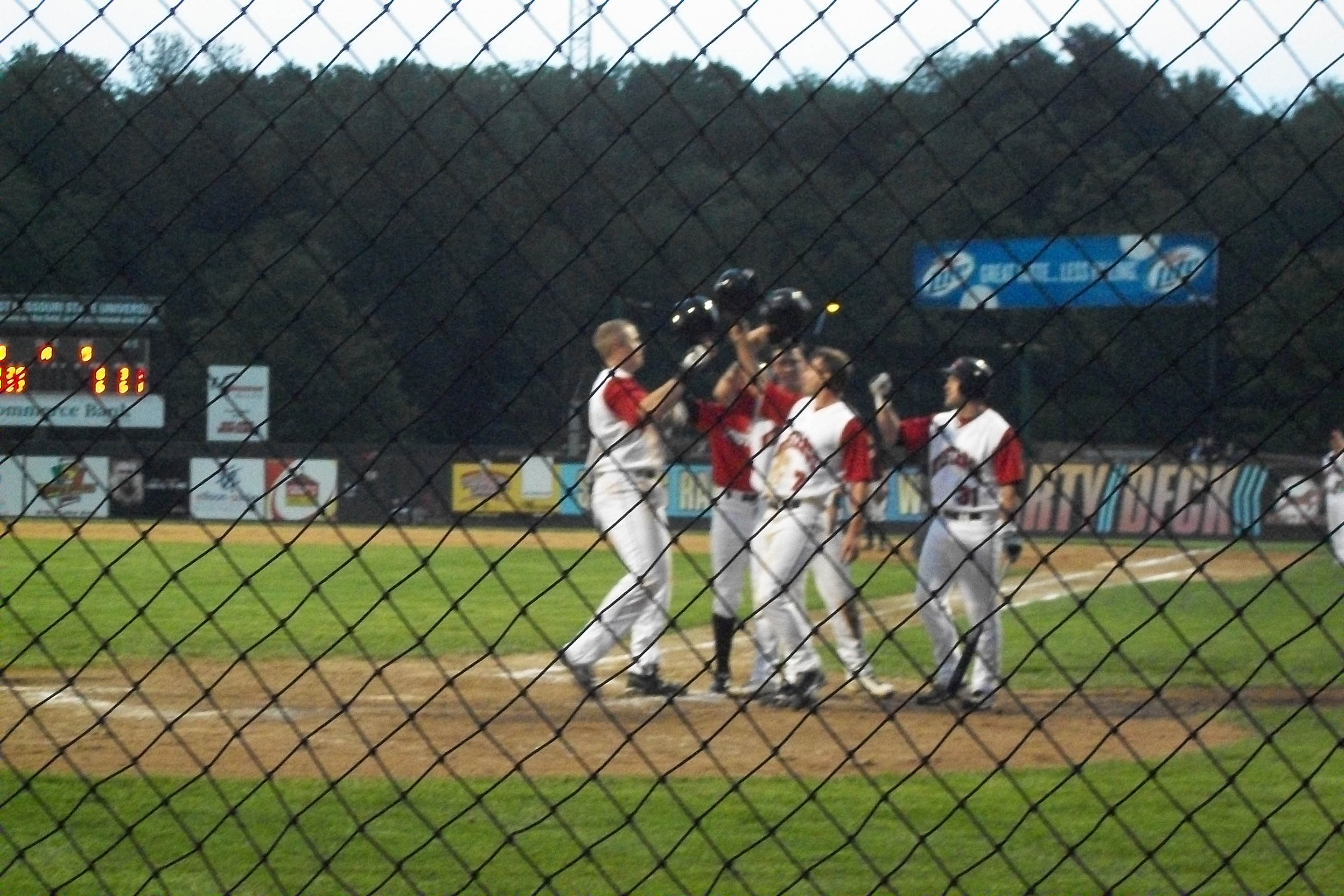 Kris Koerper and teammates celebrate after Koerper's 3-run home run, the long ball made the score 6-0.