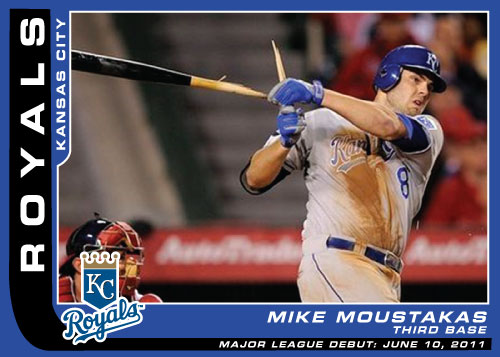 So I made the set. The set consisted of 6 cards until tonight (Eric Hosmer, Danny Duffy, Everett Teaford, Louis Coleman, Tim Collins and Aaron Crow) and those cards will get posted soon. I decided that the next player to make his Major League debut for the Kansas City Royals would be the launch of this little subset I came up with. It just so happened that it was Mike Moustakas.