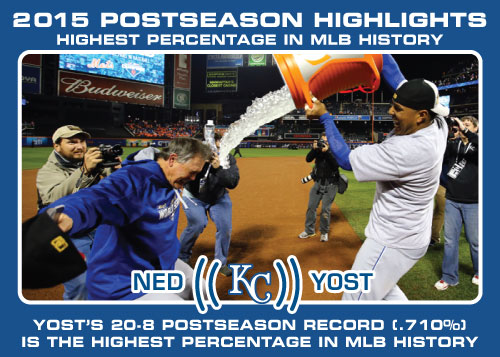 Tagged with 2015, custom cards, Kansas City Royals, manager, Ned Yost, postseason highlights, Salvador Perez, winning percentage, World Series