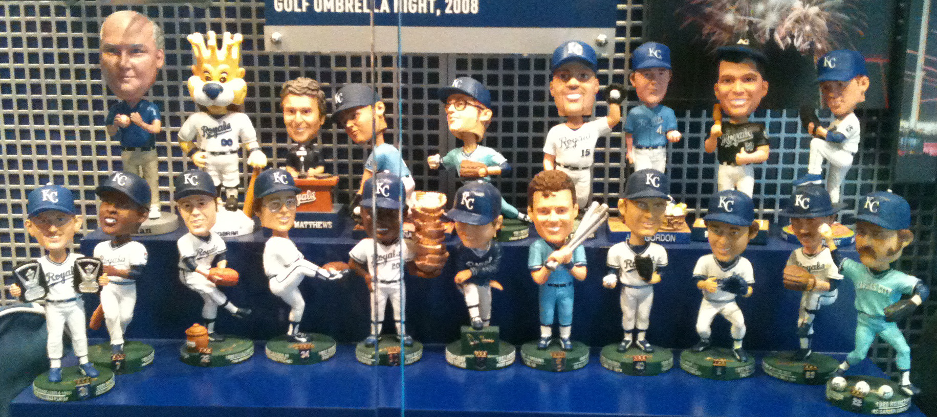 Top Row left: unknown bobblehead, Sluggerrr, Denny Matthews, Tony Pena Jr., Cookie Rojas, Carlos Beltran, Alex Gordon, Mike Sweeney and Zack Greinke.