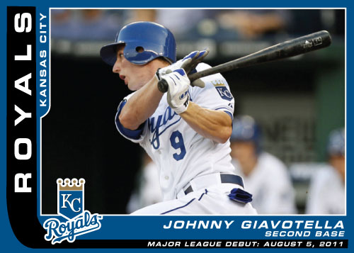 When Manny Pina made his major league debut on August 3rd I posted this card. I said that Johnny G was next to get a major league debut card, I never thought it would only be 2 days later. Gio landed with a splash the same way Manny Pina did. He went 2-3 with a double for his first major league hit. He also drove in a run, stole a base and looked comfortable in the field. His scrappy Dustin Pedroia-like play is sure to win over Kansas City Royals fans. His call-up got a lot of momentum of late, so fans were really excited to see him in the lineup. It was great to see the infield of Hosmer-Giavotella-Escobar-Moustakas, that is a lot of young talent on one field.