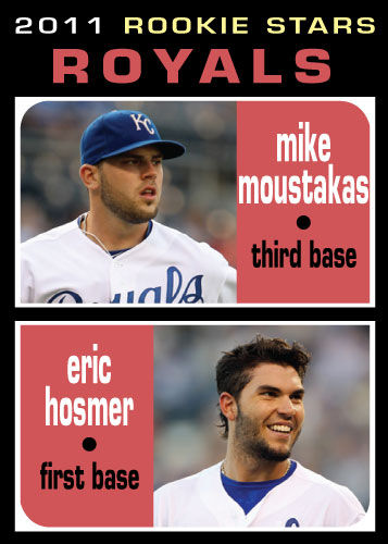 I recently picked up a couple Paul Splittorff rookie cards and immediately thought of doing this with the design. Splittorff’s rookie was the nice black 1971 Topps set. He was on a dual rookie stars card with Jerry Cram. I couldn’t resist the urge to do this card with Mike Moustakas and Eric Hosmer. Right now Hosmer is a lot more of a rookie star than Moustakas but they are both everyday players in the major leagues and are well deserving of this card.
